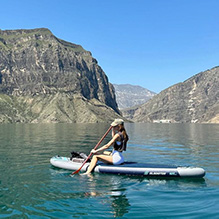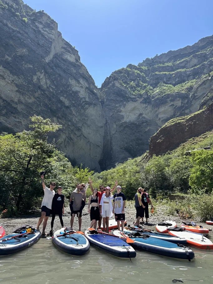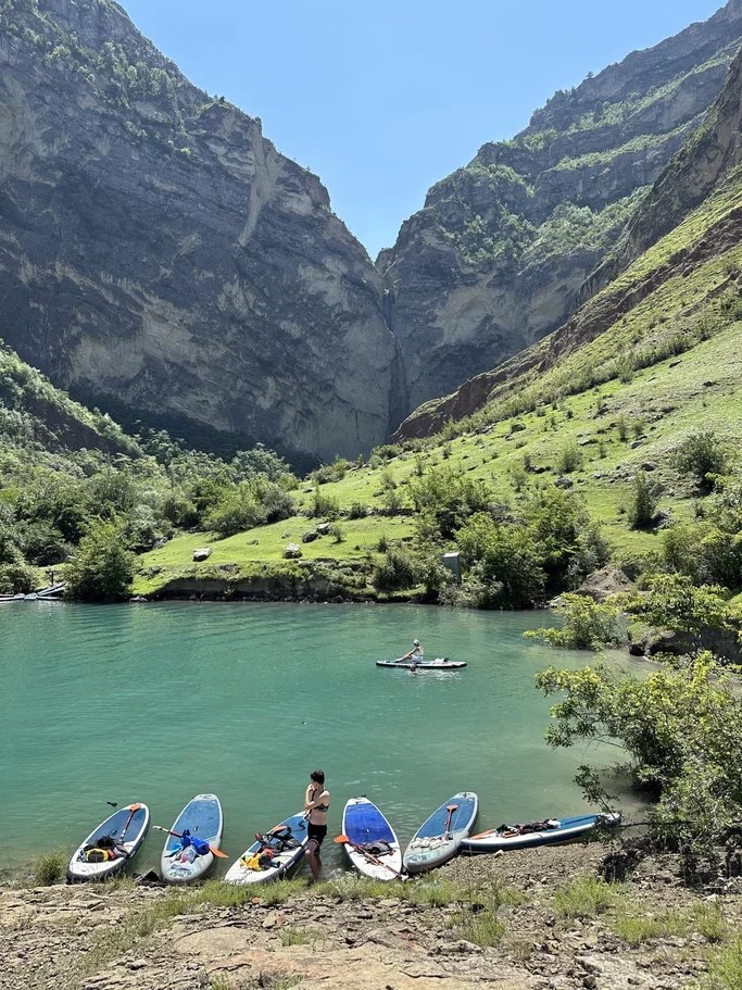 Набравшись сил, мы отправляемся на сапбординг — путешествие по бирюзовому Ирганайскому водохранилищу. На том берегу прогуляемся до дикого водопада, что скрыт от глаз обычных туристов.